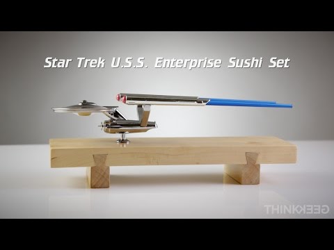 These are the sushi of the starship Enterprise. The Star Trek U.S.S. Enterprise Sushi Set is full set of sushi-ware shaped like the U.S.S. Enterprise from the original Star Trek TV series. The wooden base is actually a sushi plate. Remove the top of the saucer section, and you have a little dish for your soy sauce. And slide out the warp effect from the nacelles and you'll have a pair of chopsticks! The Star Trek U.S.S. Enterprise Sushi Set is just the thing to elevate sushi... into the final frontier!